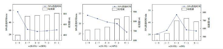 圖3復(fù)配組分對(duì)50%消泡時(shí)間和泡沫量的影響
