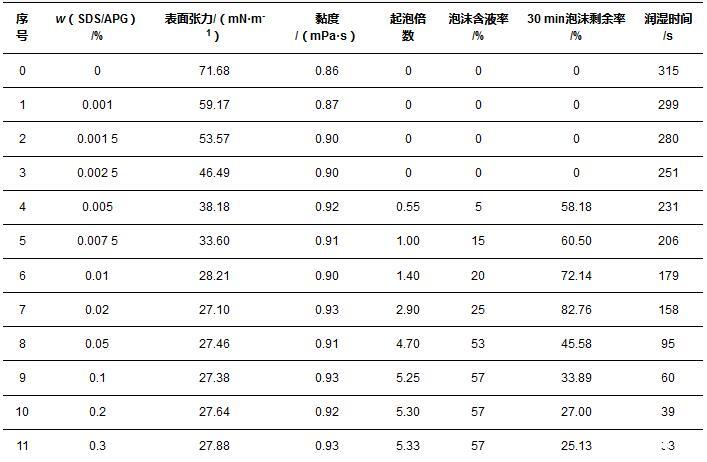 2)在SDS和APG構(gòu)成的表面活性劑體系中,溶液表面張力的降低,有利于起泡、泡沫攜液、泡沫穩(wěn)定性和潤(rùn)濕能力的提升。當(dāng)質(zhì)量分?jǐn)?shù)大于cmc時(shí),表面張力幾乎不變;在測(cè)定范圍內(nèi),隨著質(zhì)量分?jǐn)?shù)增加,溶液起泡能力呈現(xiàn)先增加后平穩(wěn)的趨勢(shì),泡沫穩(wěn)定性降低,潤(rùn)濕性能提升。
