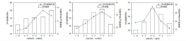 實(shí)驗(yàn)測(cè)得SLES,SDS,APG和BS在w=0.2%時(shí)的50%消泡時(shí)間依次為28.5,45,41和9 min,起泡量依次為800,290,610和700 mL。由圖3可知,對(duì)比三組復(fù)配組分的泡沫性質(zhì),SLES/SDS無明顯增效,隨著SLES質(zhì)量分?jǐn)?shù)的增加,復(fù)配組分的起泡量和50%消泡時(shí)間接近SLES單組分。SLES/APG的起泡性和泡沫穩(wěn)定性有所提升,其中w(SLES):w(APG)=7:3的復(fù)配組分有較好的泡沫性能,50%消泡時(shí)間、起泡量分別為30 min、825 mL。SLES/BS的起泡量減少,但50%消泡時(shí)間明顯增加,其中w(SLES):w(BS)=5:5的50%消泡時(shí)間、起泡量分別為46.5 min、695 mL。