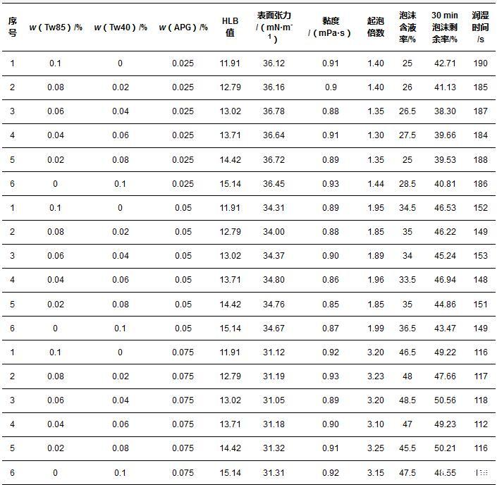 選用非離子-非離子表面活性劑復(fù)配體系,以吐溫85(Tw85)、吐溫40(Tw40)、烷基糖苷(APG)復(fù)配組分作為實(shí)驗(yàn)對(duì)象,實(shí)驗(yàn)中發(fā)現(xiàn)Tw85和Tw40混合溶液無法產(chǎn)生穩(wěn)定泡沫,因此將Tw85和Tw40復(fù)配組分作為HLB值調(diào)節(jié)組分,添加APG作為輔助起泡劑。實(shí)驗(yàn)結(jié)果見表1。