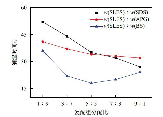 實(shí)驗(yàn)測(cè)得SLES,SDS,APG和BS在w=0.2%時(shí)的潤(rùn)濕時(shí)間依次為26,102,39和42 s。由圖5可知,SLES與SDS、APG復(fù)配時(shí),潤(rùn)濕性能未表現(xiàn)出明顯的增效作用,潤(rùn)濕時(shí)間的降低可歸因于SLES的潤(rùn)濕能力更好,因此隨著SLES組分的增加,復(fù)配溶液的潤(rùn)濕時(shí)間降低。SLES與BS復(fù)配時(shí),潤(rùn)濕能力表現(xiàn)出明顯的增效作用,當(dāng)質(zhì)量分?jǐn)?shù)比為5:5時(shí),潤(rùn)濕時(shí)間為18 s,低于兩種單一物質(zhì)的潤(rùn)濕時(shí)間。
