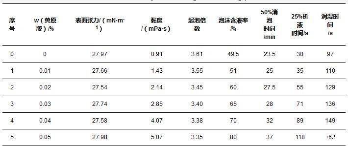 由表3可知,隨著黏度的增加,起泡倍數(shù)呈現(xiàn)下降趨勢(shì),當(dāng)黏度為0.91 mPa·s時(shí),起泡倍數(shù)為3.61,當(dāng)黏度為5.07 mPa·s時(shí),起泡倍數(shù)為3.35。導(dǎo)致起泡倍數(shù)降低的原因可能與流動(dòng)性和表面張力等因素有關(guān),隨著溶液黏度的增加,溶液的流動(dòng)性降低,表面活性劑向氣液界面遷移的能力減弱;由實(shí)驗(yàn)結(jié)果可知,黃原膠的加入對(duì)表面張力無明顯影響,表明黃原膠屬于非表面活性物質(zhì),它的加入增加了液體的流阻但沒有增加液體流動(dòng)的推動(dòng)力(即降低表面張力),因此溶液的起泡能力下降。