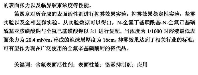 第四章對所合成的表面活性劑進(jìn)行抑霧效果實(shí)驗(yàn),抑霧效果穩(wěn)定性實(shí)驗(yàn),鹽霧實(shí)驗(yàn)以及金相顯微實(shí)驗(yàn)。從實(shí)驗(yàn)數(shù)據(jù)可以得出,N-全氟丁基磺酰基-N-全氟己基磺酰基亞胺磺酸鈉與全氟己基磺酸鉀以3:1進(jìn)行復(fù)配,當(dāng)濃度為1/1000時(shí)溶液最低表面張力為20.4mN/m,形成的泡沫層厚度為16cm,抑霧效果達(dá)到了相關(guān)行業(yè)的標(biāo)準(zhǔn),可有望作為現(xiàn)在廣泛使用的全氟辛基磺酸鉀的替代品。