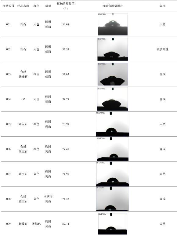 本文運(yùn)用現(xiàn)代儀器(FTA200動態(tài)接觸角測量儀)測量了15個(gè)天然和合成寶玉石品種(鉆石、合成碳硅石、合成立方氧化鋯、碧璽、托帕石、翡翠、琥珀等),以及經(jīng)覆膜和充填2種處理方法的寶玉石樣品(鍍膜鉆石、覆膜托帕石、覆膜翡翠、覆膜琥珀、充填碧璽)的表面接觸角,并運(yùn)用公式計(jì)算其表面張力。