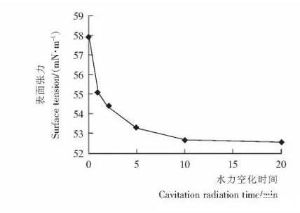 空化時(shí)間對(duì)原糖溶液表面張力的影響配置濃度為0.15g/mL的原糖溶液3.5L,水浴加熱溶液到60℃,在0.2 MPa壓力下通過空化裝置循環(huán)不同的時(shí)間(1,2,5,10,20min),測(cè)定空化前后原糖溶液的表面張力的變化。