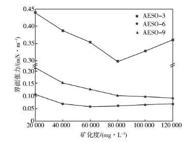 從圖2可以看出,隨著礦化度的增加,AESO-3的界面張力先降低后升高,AESO-6和AESO-9界面張力降低到平衡值后基本保持穩定,在礦化度達到120 000 mg/L時界面張力仍能達到10-2mN/m數量級,這說明EO聚合度的增加提高了脂肪醇聚醚磺酸鹽的耐鹽性能。這一現象可以用無機鹽對表面活性劑在溶液中的聚集形態的影響來解釋[15]。通常表面活性劑中的雙親基團各自趨向于自身親和力強的溶液中,在油水界面規則排列形成一層親水基向外、憎水基向內的薄層,溶液中濃度達到一定時,表面活性劑分子發生聚集形成膠束。加入適量無機鹽,無機鹽正離子受靜電作用會在親水基附近聚集能夠降低親水基之間的靜電排斥、改變表面活性劑在界面的堆積形態,從而降低油水界面張力;隨著無機鹽濃度繼續增大,無機鹽離子對表層進一步壓實,油相無法進入膠束中導致界面張力增大。而對于非離子-陰離子表面活性劑,中性親水基團EO的引入減弱了無機鹽對界面親水基的靜電作用,從而使其在礦化度較高的時候仍然能夠保持良好的界面活性。