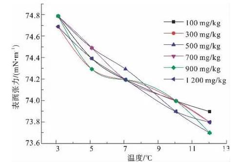 圖5為100、200、300、500、700、900 mg/kg濃度下,陰離子表面活性劑CTAB溶液的表面張力隨溫度變化示意圖。由圖5可知,300 mg/kg溶液的表面張力曲線最低,說明該濃度的溶液表面活性最強。在所測溫度范圍內,隨溫度升高表面張力變化較大,整體上表面張力曲線呈波浪狀,出現拐點。6條曲線在3℃時均出現最低表面張力值,在5℃附近均出現波峰;100、500和900 mg/kg溶液在7℃附近時出現波谷,10℃附近再次出現波峰;200、300和700 mg/kg溶液在10℃附近出現波谷。