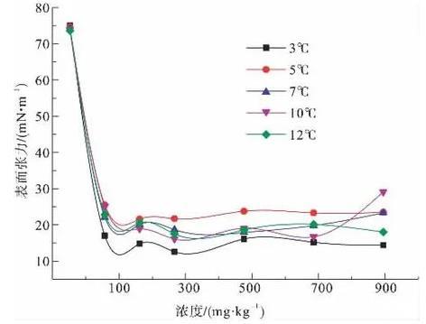 圖3為3、5、7、10、12℃下,非離子型表面活性劑P123溶液的表面張力隨濃度變化示意圖。由圖3可知,P123在低濃度下就能夠顯著降低溶液表面張力,在400 mg/kg時表面張力達到最低值,之后隨濃度增大,表面張力變化不大,因此CTAB的臨界膠束濃度CMC即在此濃度范圍附近。在所測溫度范圍內,當P123溶液達到CMC以后,表面張力值在40.5~45.5 mN/m之間。隨溫度變化,表面張力值相差較大。