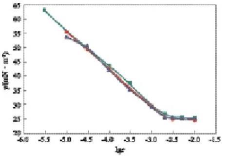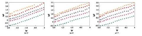 在lgc=-3.00時(shí),可看出較完整的動態(tài)表面張力降低曲線,開始時(shí)表面張力接近溶劑的表面張力,隨時(shí)間的延長表面張力先快速下降,降至一定數(shù)值后,降幅趨緩,在一段時(shí)間內(nèi)基本保持不變。因?yàn)闅?液界面新生成時(shí),GSS362尚未在表面吸附,界面張力為溶劑的表面張力,隨著時(shí)間的延長,表面活性劑分子開始在表面吸附,氣/液界面張力降低,隨著吸附的進(jìn)行,表面逐步趨于飽和,表面活性劑分子在表面吸附的速率下降,因而動態(tài)表面張力下降速率變慢,趨于平衡。