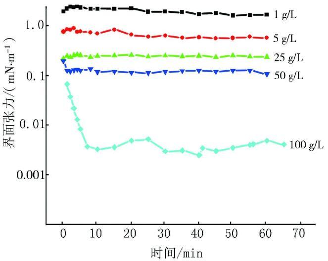 為了選擇合適界面張力體系來進行驅(qū)油實驗,實驗室內(nèi)配置了礦化度分別為1,5,25,50,100 g/L,質(zhì)量分?jǐn)?shù)為0.2%的9AS-3-0溶液,并對其與原油之間的界面張力進行了測量。實驗結(jié)果見圖1。