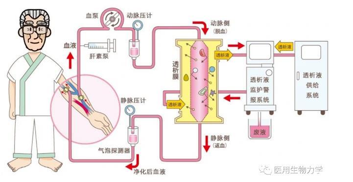 血液透析是急慢性腎功能衰竭患者腎臟替代治療方式之一。通過將體內(nèi)血液引流至體外,經(jīng)一個(gè)由無數(shù)根空心纖維組成的透析器中,血液與含機(jī)體濃度相似的電解質(zhì)溶液(透析液)在一根根空心纖維內(nèi)外,隔著半透膜進(jìn)行透析,通過彌散、超濾、吸附和對(duì)流原理進(jìn)行物質(zhì)交換,清除體內(nèi)的代謝廢物、維持電解質(zhì)和酸堿平衡;同時(shí)清除體內(nèi)過多的水分,并將經(jīng)過凈化的血液回輸?shù)恼麄€(gè)過程稱為血液透析。