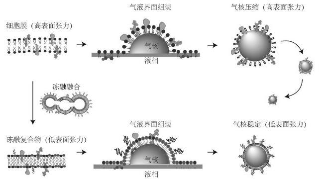 細胞膜是由蛋白質與膽固醇等分子鑲嵌在磷脂中的典型雙分子層結構。細胞膜仿生技術已經成功實現在納米顆粒以及納米液滴表面修飾組裝,并實現體內的長循環以及良好生物相容性。典型的細胞膜仿生技術是將剝離后的細胞膜直接以磷脂雙分子層的形式包被于納米顆粒或液滴表面。然而由于表面張力作用,細胞膜的磷脂雙分子層無法直接包被在微米級的氣泡表面。