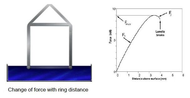 由于距離不同表現(xiàn)出的表面張力也不同,因此測量往往取最大值,也就是右方圖中的Fmax